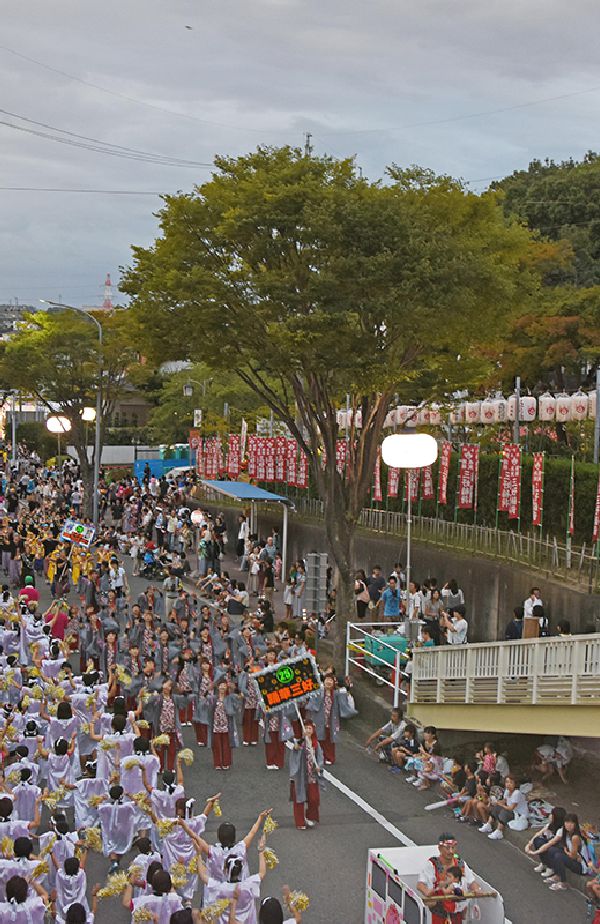 会場となる三好稲荷閣周辺道路には、さまざまな衣装を身にまとった約2,500人の踊り手たちが集結し、オリジナルまつりソング「じゃんだらりん」「JUST ROLLIN」を踊る、踊り手も観客も一体となれるイベントです。
